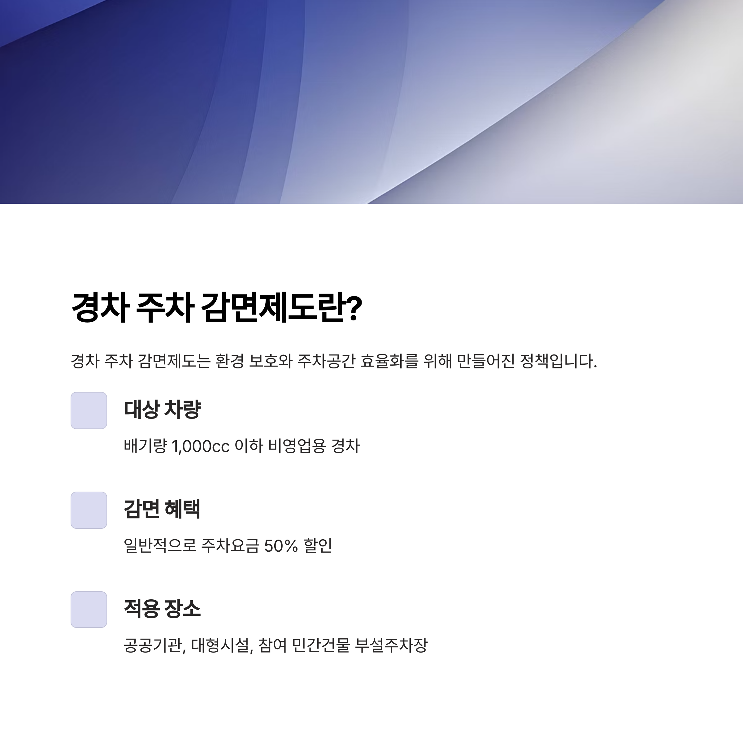 ① 경차 부설주차장 감면율은 일반적으로 주차요금의 50%입니다. 예를 들어, 공공기관이나 대형시설에서 1,000cc 이하 경차로 주차할 경우, 정산 시 자동으로 50% 감면 처리됩니다.