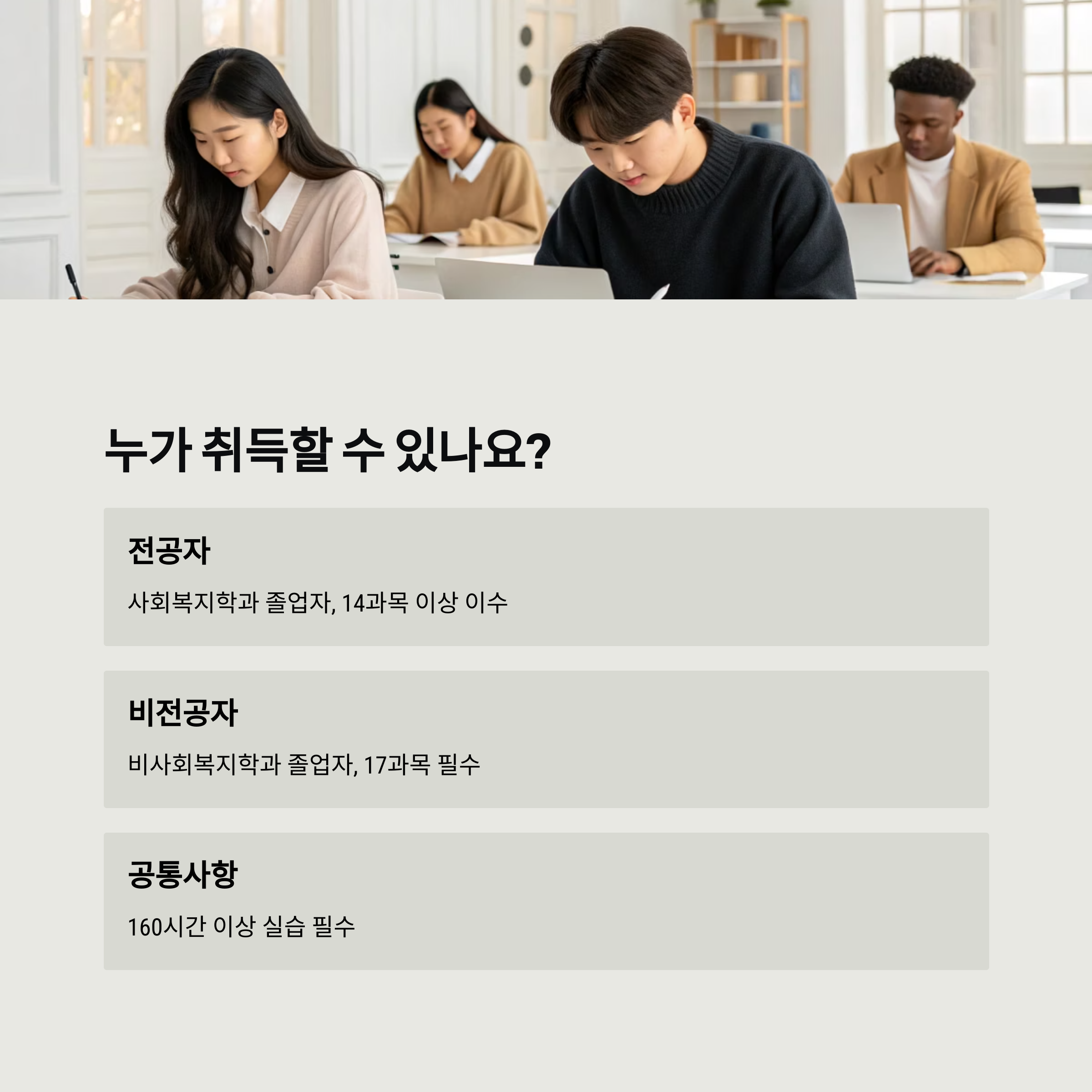| 비전공자 | 비사회복지학과 졸업자 | 사회복지 관련 17과목 필수 |