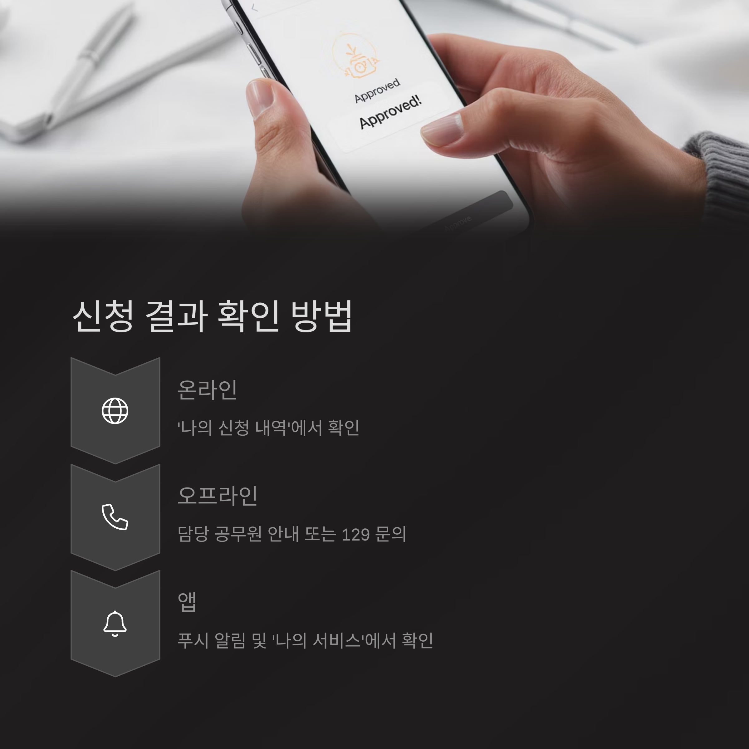 오프라인으로 신청한 경우에는 담당 공무원의 안내를 통해 결과 확인이 가능하며, 불가피한 경우 전화 문의 (☏ 보건복지콜센터 129)를 통해 조회할 수 있습니다.