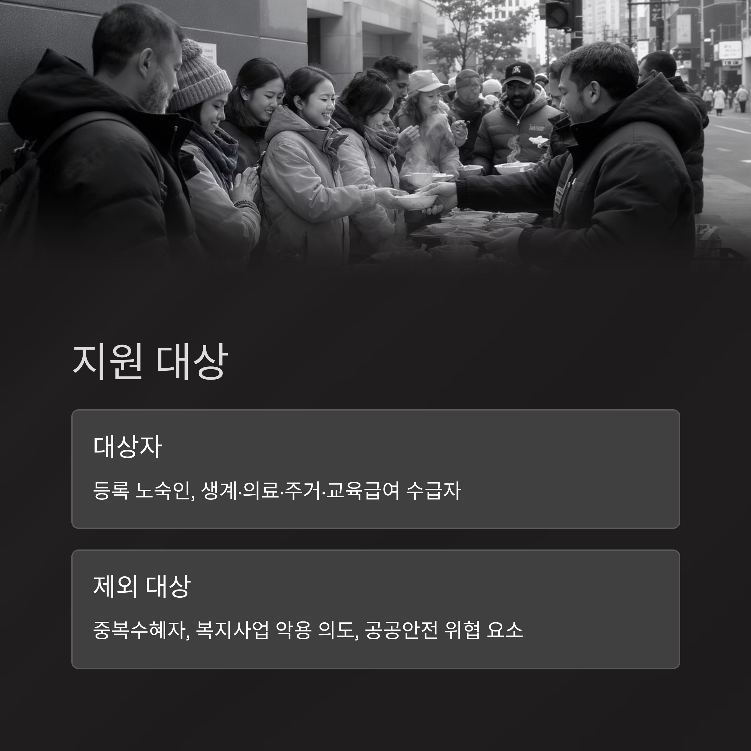 | 주거 지원 | 등록 노숙인, 체류 최소 30일 이상 | 임시 거처 제공, 주거 비용 보조 |