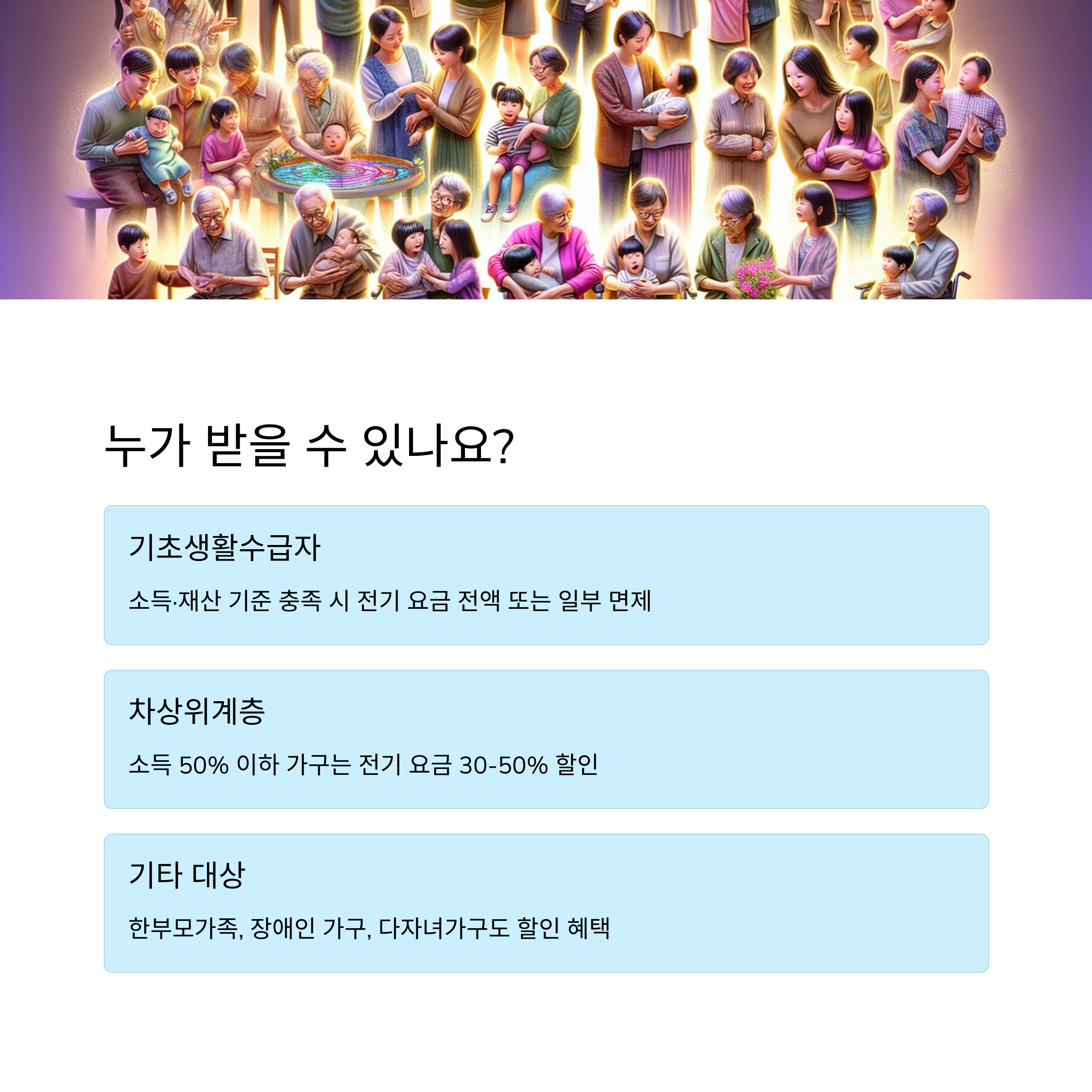 | 차상위계층 | 소득 50% 이하 | 전기 요금 30~50% 할인 |