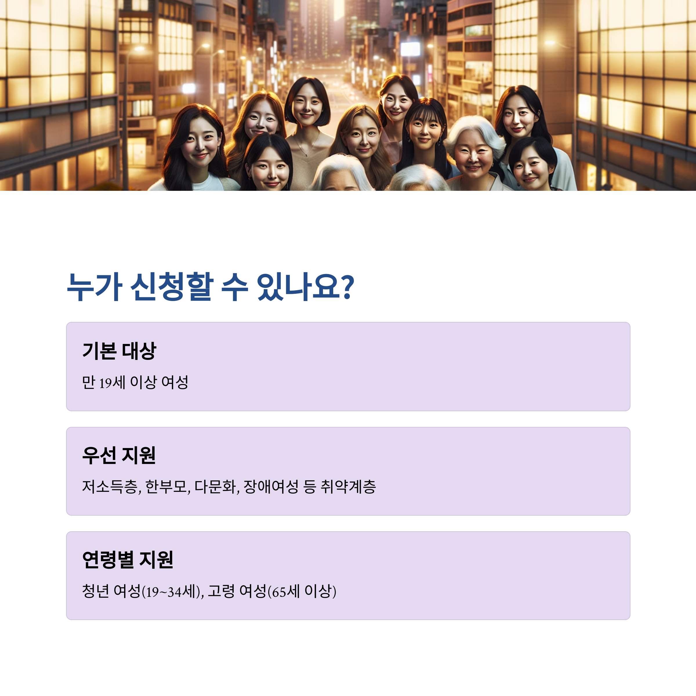 여성안심패키지의 기본 대상은 만 19세 이상 여성으로, 일정 소득 이하이거나 취약계층(한부모, 다문화, 장애여성 등)인 경우 우선 지원됩니다. 단, 지역별 지자체별 예산과 정책에 따라 지원 우선순위 및 항목이 다소 차이가 있을 수 있습니다.