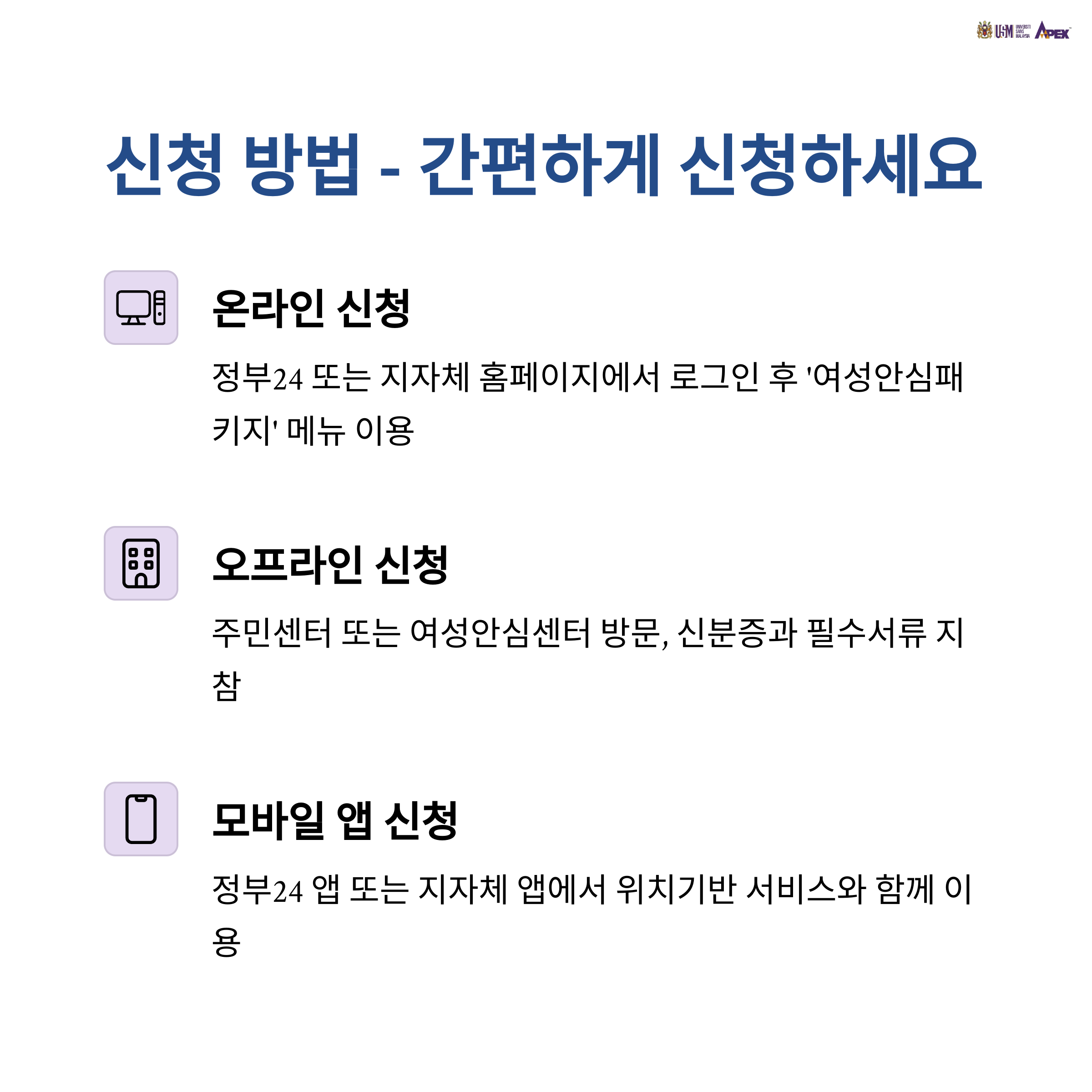 온라인 신청은 정부24(www.gov.kr) 또는 지역 지자체 홈페이지에 로그인 후 ‘여성안심패키지’ 메뉴를 통해 가능합니다. 개인정보 입력과 지원 항목 선택 후, 본인 인증(공동인증서·휴대폰 인증)을 마치면 신청이 완료됩니다.