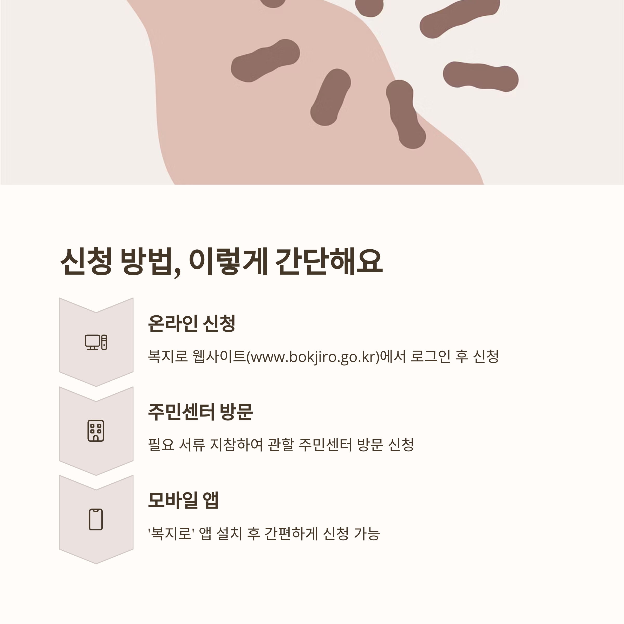 모바일 앱으로도 간편하게 신청할 수 있는데요. ‘복지로’ 모바일 앱을 설치 후 로그인하면 온라인과 동일한 절차로 신청할 수 있으며, 진행 상황도 알림으로 빠르게 확인할 수 있어 더욱 편리합니다.