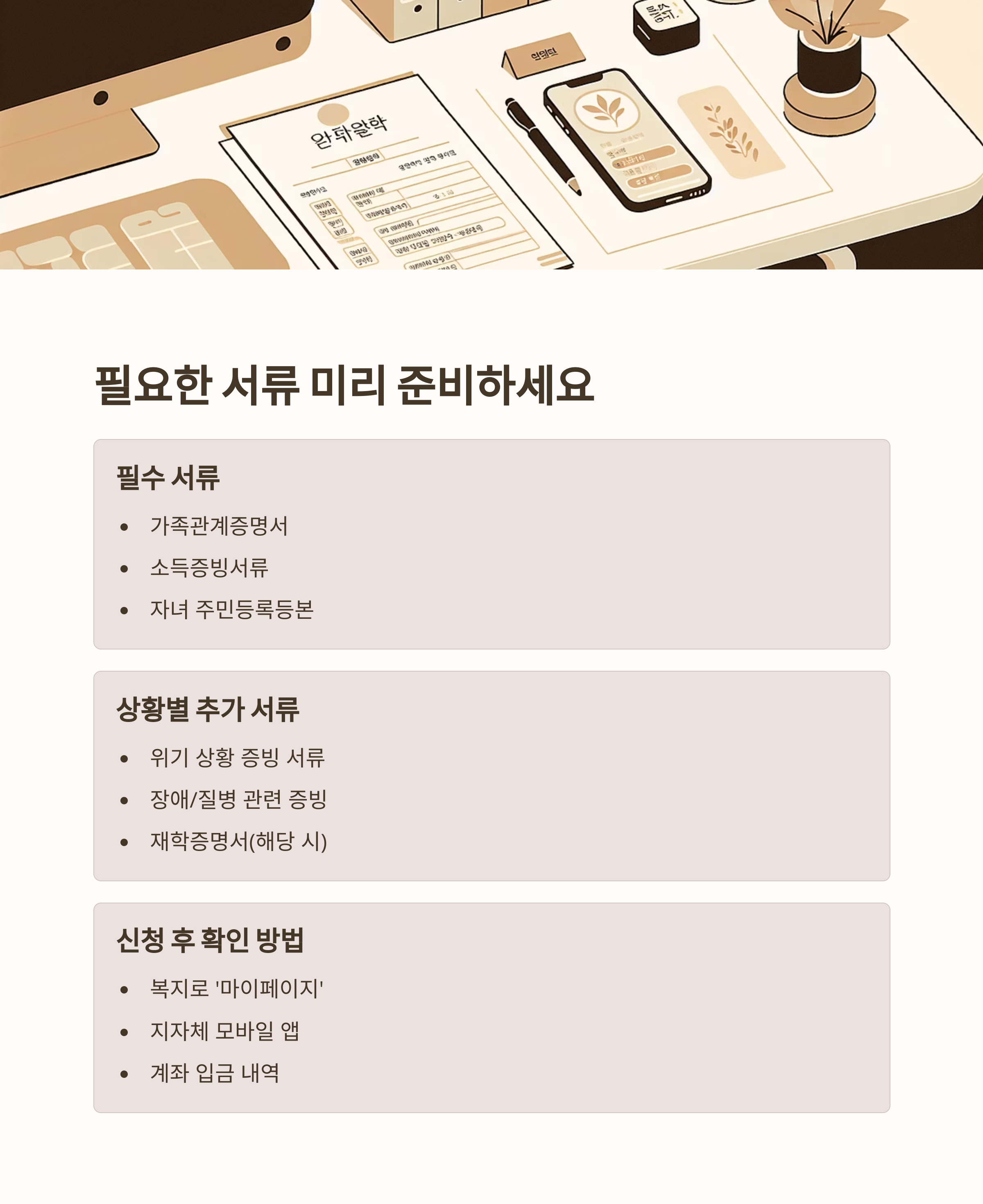 법적 근거는 「한부모가족지원법」과 「아동복지법」에 기반하며, 예외적으로 긴급 위기 상황(예: 실직, 질병 등)에서는 기준을 일부 완화하여 지원 가능합니다.