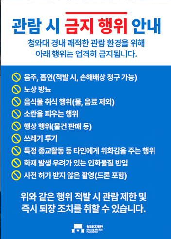 ② 관람 시 ▲신분증 확인 ▲보안 검색 ▲휴대품 검사 등이 이루어지므로 협조가 필요합니다. 특정 물품(카메라, 음식물, 음료 등)은 반입이 제한되며, 가방은 별도로 보관하게 됩니다.