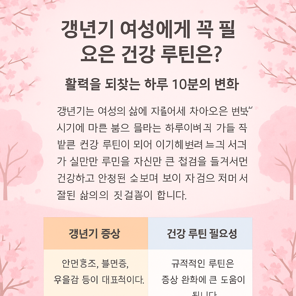 갱년기는 여성의 삶에서 자연스럽게 찾아오는 변화의 시기입니다. 하지만 많은 분들이 신체적 불편함이나 정서적 기복 등으로 인해 힘들어하시곤 합니다. 그럴수록 더욱 중요한 것이 바로 올바른 건강 루틴입니다. 하루 10분, 자신의 몸과 마음을 돌보는 습관만으로도 일상에 큰 활력을 불어넣을 수 있습니다. 오늘은 갱년기를 건강하게 극복할 수 있는 실천 방법과 관리 루틴에 대해 이야기해보려 합니다. 갱년기 증상을 단순히 버텨내는 것이 아닌, 적극적으로 스스로를 돌보는 시간으로 바꾸는 것이 건강하고 안정된 삶을 위한 첫걸음이 될 것입니다. 이 글을 통해 많은 분들이 일상의 균형을 되찾고 자신만의 루틴을 만들어가시길 바랍니다.