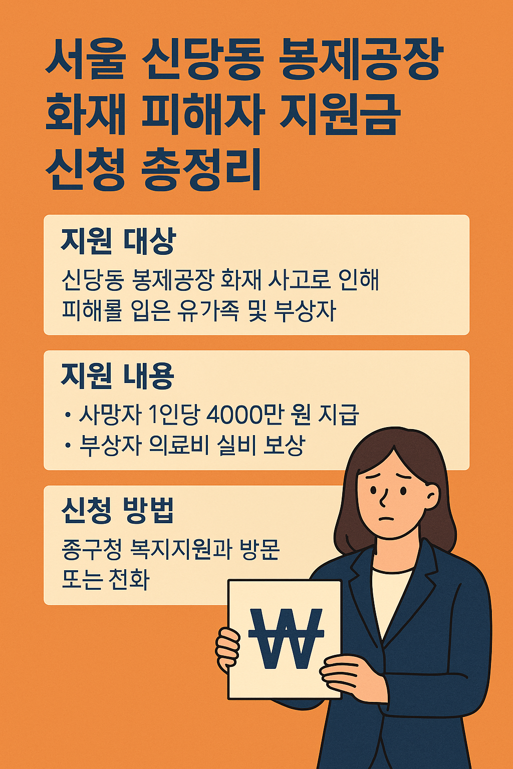 이번 화재 지원금은 서울 중구 신당동 봉제공장 화재로 피해를 입은 피해자 및 그 가족을 대상으로 합니다. 구체적으로는 화재로 인해 부상이나 재산 피해를 입은 직접 피해자뿐만 아니라, 피해로 인해 생계가 어려워진 직계가족도 일정 조건을 충족하면 지원 대상에 포함됩니다.