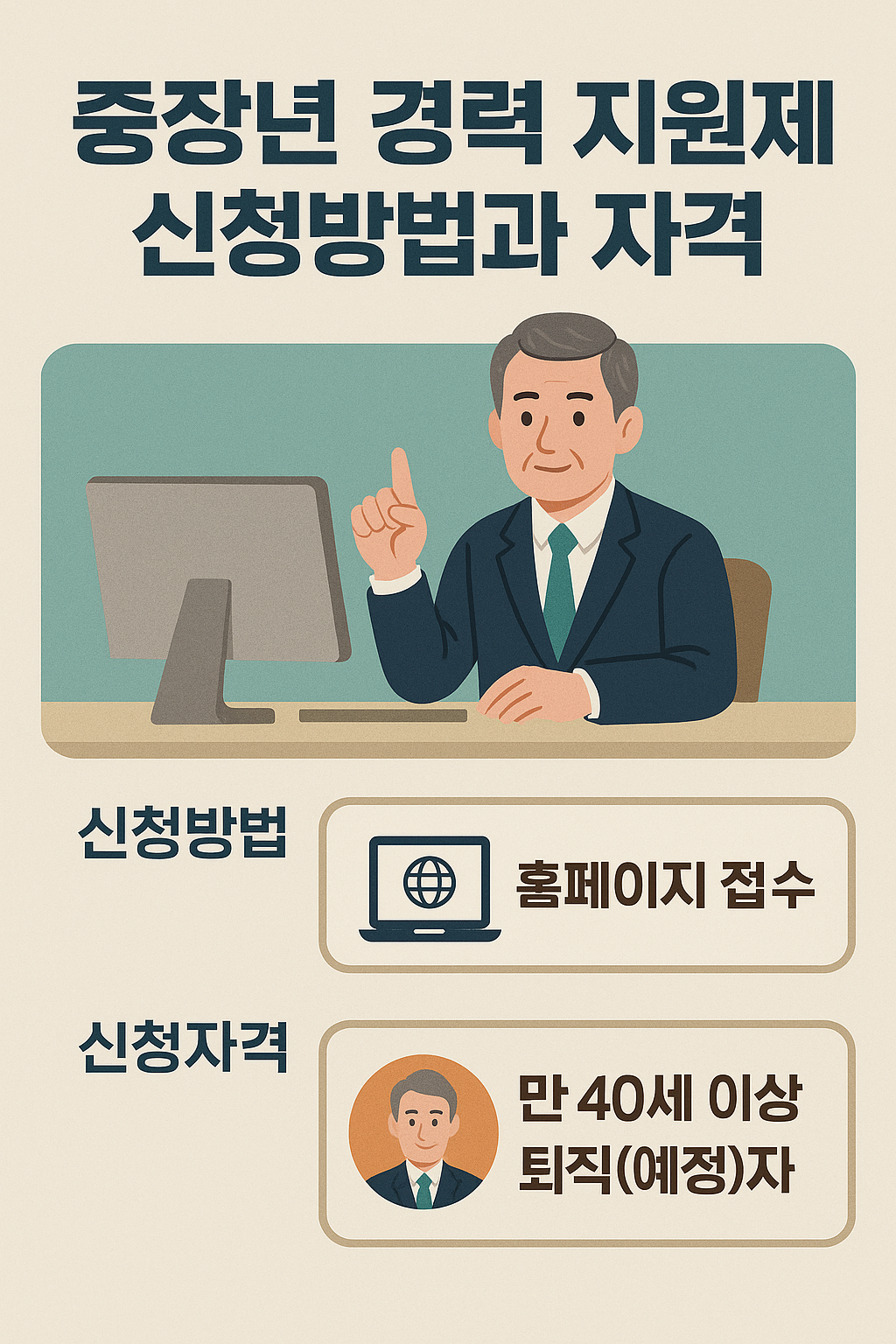 중장년 경력지원제는 만 40세 이상 중장년층이 구직이나 경력 전환을 위해 신청할 수 있는 제도입니다 특히 퇴직 이후 새로운 직업을 찾고자 하는 경우에 적극 활용됩니다