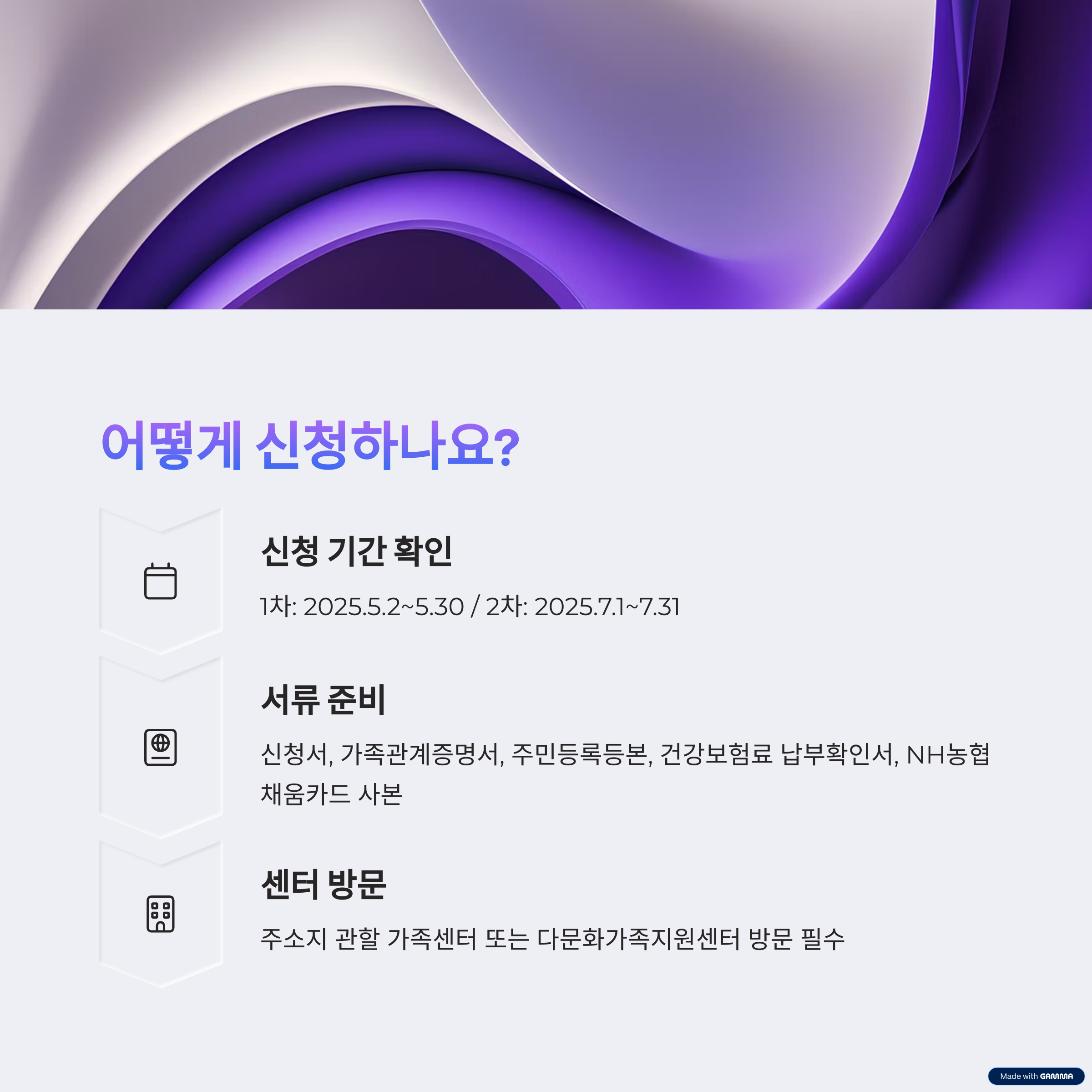 신청 기간은 1차 2025년 5월 2일부터 5월 30일까지, 2차 2025년 7월 1일부터 7월 31일까지입니다. 신청자는 해당 기간 내에 구비서류를 준비하여 가족센터를 방문하여 신청 절차를 진행해야 합니다.