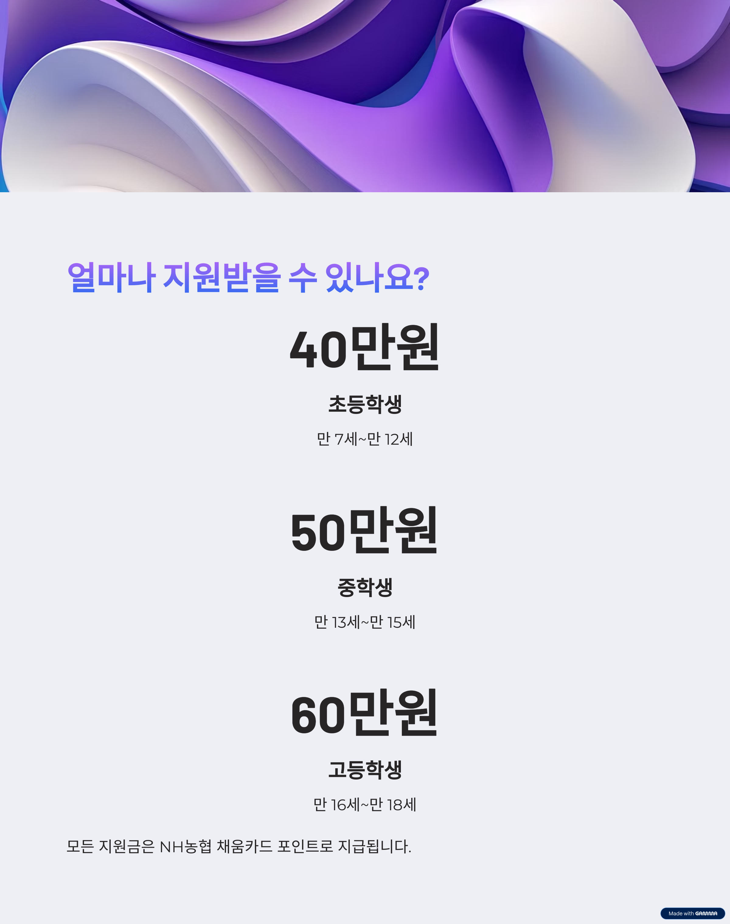 다문화가족 자녀 교육활동비는 자녀의 학령에 따라 연간 지원 금액이 차등 적용됩니다. 초등학생은 연간 40만 원, 중학생은 50만 원, 고등학생은 60만 원까지 지원받을 수 있으며, 모든 지원금은 NH농협 채움카드 포인트로 지급됩니다. 해당 포인트는 교육용으로만 사용 가능하며, 학원 수강, 교재 구입, 체육 및 예체능 활동비 등에 활용할 수 있습니다.