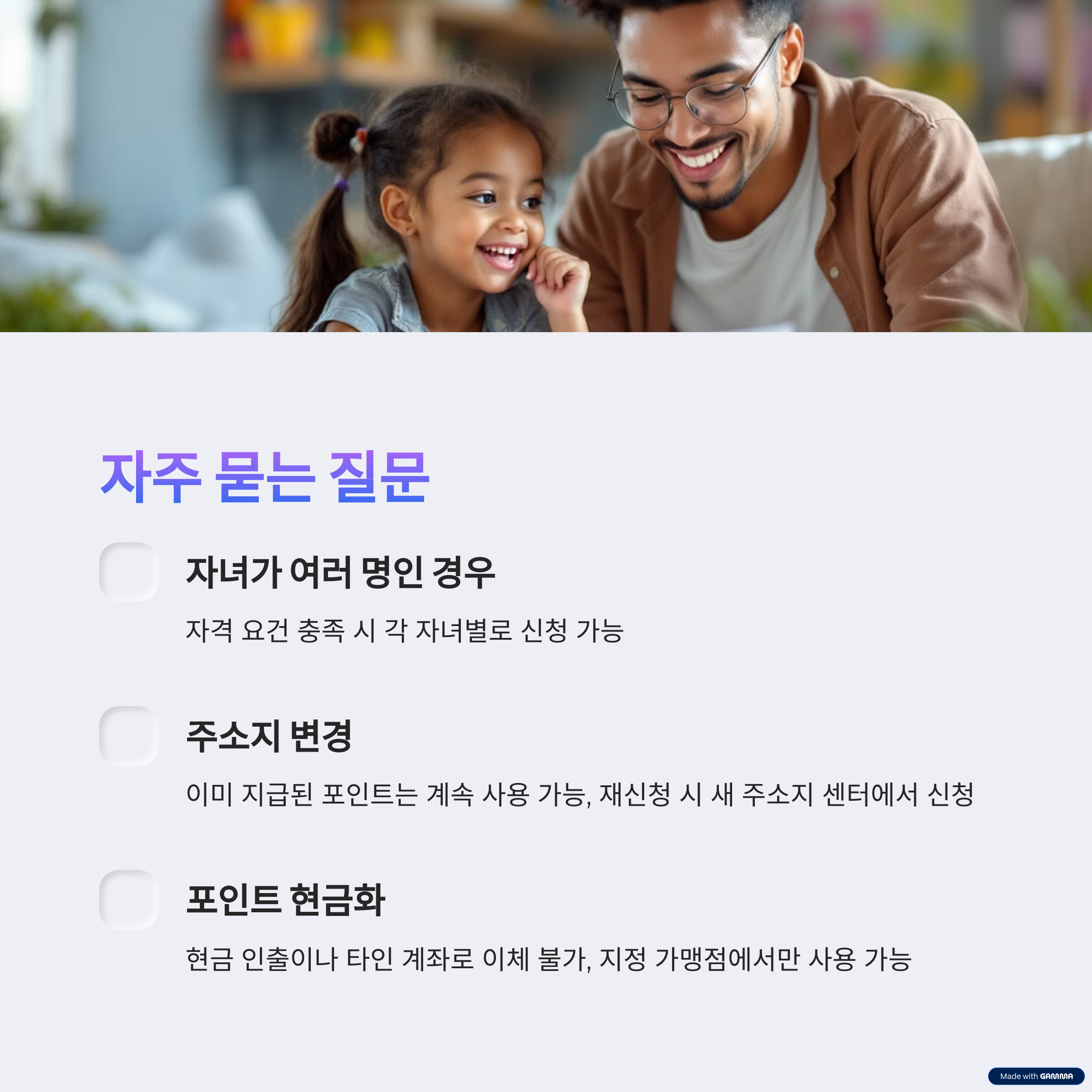 A2. 주소지를 변경해도 이미 지급된 포인트는 기존 카드로 사용할 수 있습니다. 다만, 향후 재신청 시에는 변경된 주소지 관할 가족센터에서 신청해야 하므로, 주소지 변경 사실을 반드시 센터에 통보해야 합니다.