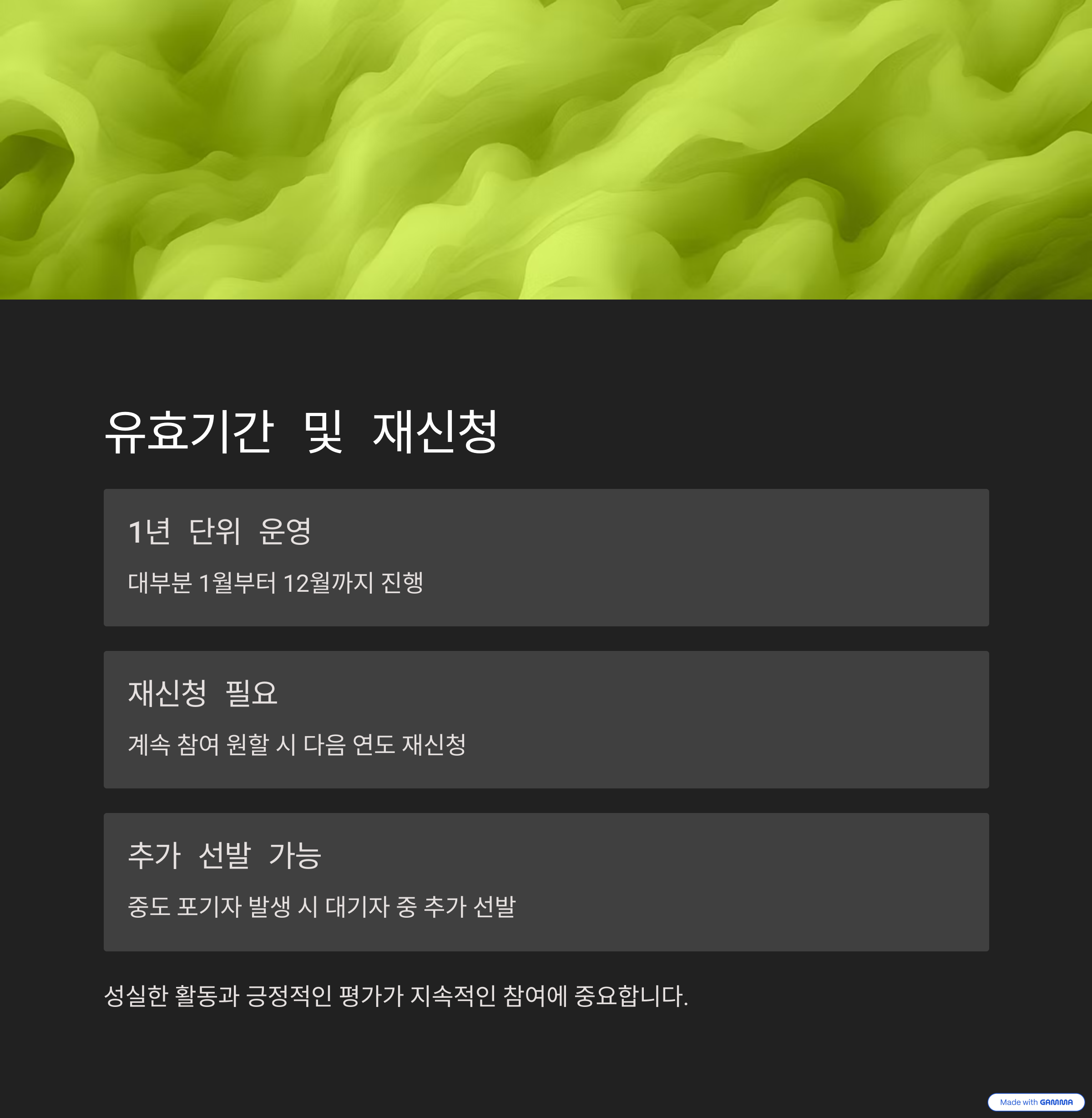 선정되신 경우, 안내받은 일정에 따라 오리엔테이션 및 교육에 참석하셔야 하며, 이후 본격적인 활동이 시작됩니다. 선정되지 않으신 경우에도 대기자로 등록되어 결원이 발생할 경우 순차적으로 참여 기회가 주어질 수 있습니다.