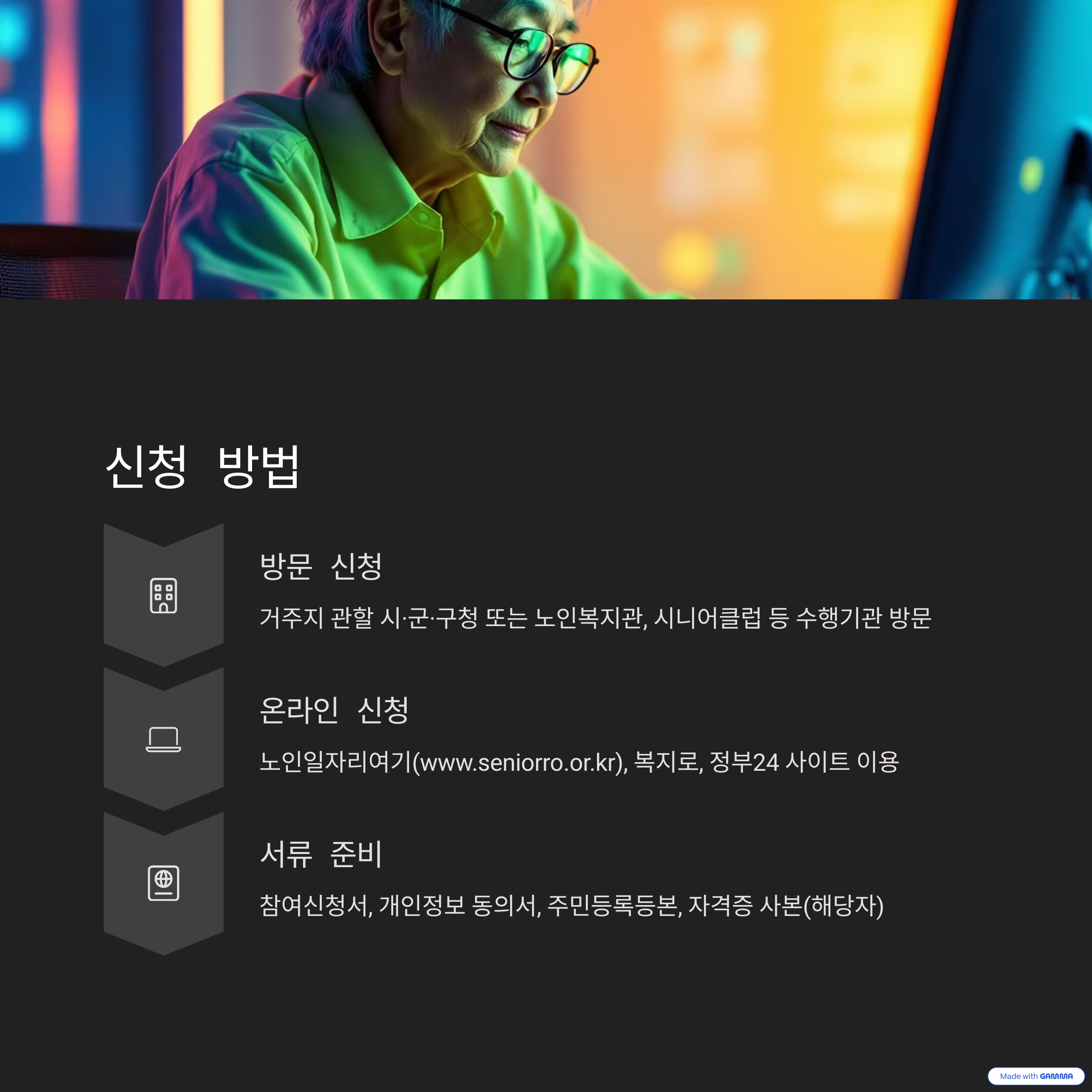 온라인 신청을 원하시는 분들은 '노인일자리여기(www.seniorro.or.kr)'에 접속하여 거주 지역을 검색한 후, 원하는 일자리 정보를 확인하고 '접수하기'를 클릭하여 신청할 수 있습니다. 또한, 복지로(www.bokjiro.go.kr)나 정부24(www.gov.kr)를 통해서도 신청이 가능합니다. 이 경우, 회원가입 및 로그인이 필요하며, 민원서비스 신청 메뉴에서 노인일자리사업을 선택하여 진행하시면 됩니다.