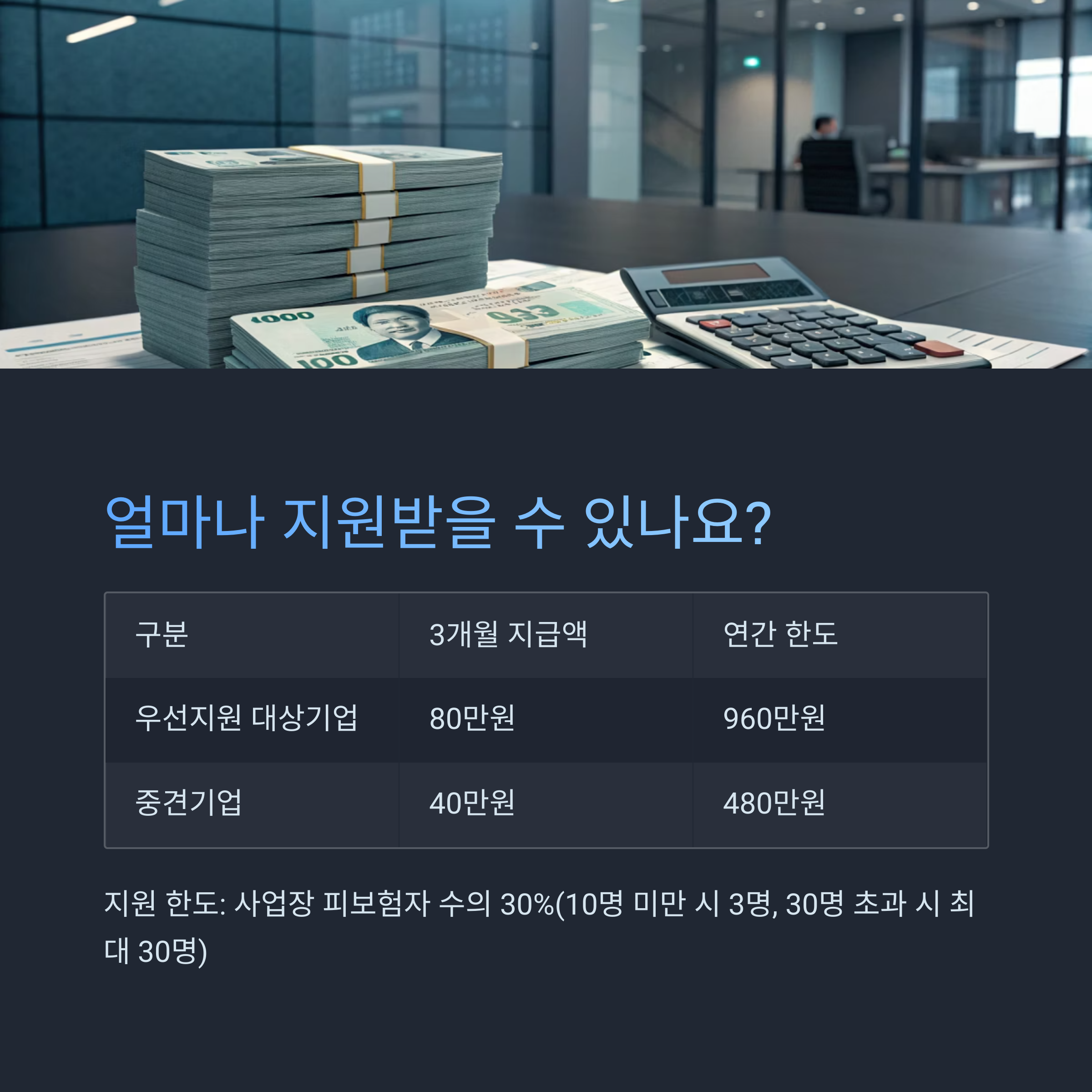 ② 지원 한도는 사업장 직전 보험년도 말일 기준 피보험자 수의 30%이며, 피보험자 수가 10명 미만일 경우 3명 한도, 30명 초과 시 최대 30명 한도 내에서 적용됩니다. 지원금은 근로자 임금의 최대 80% 범위에서 지급됩니다.
