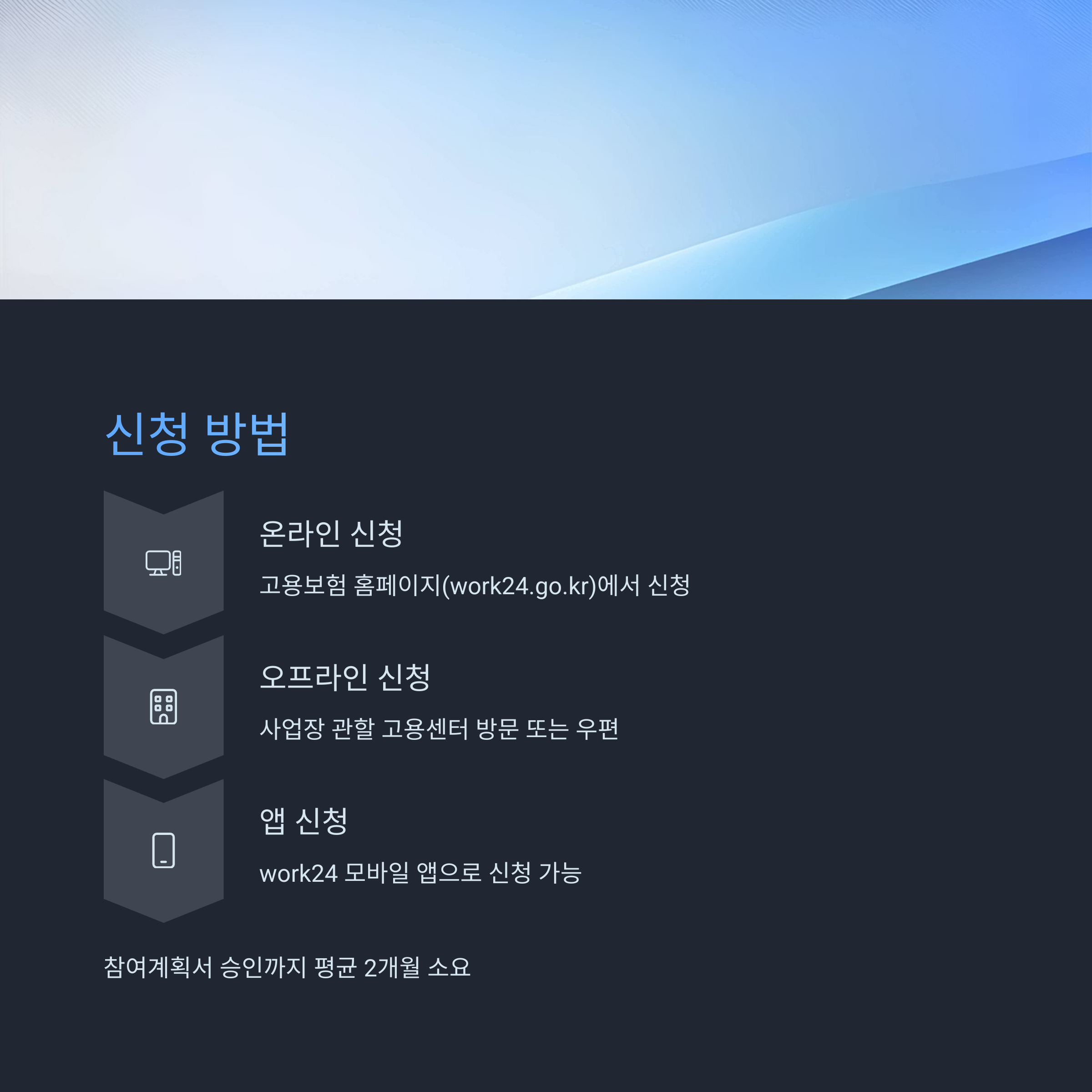 ① 온라인 신청: 고용보험 홈페이지(work24.go.kr)에 접속해 ‘고용장려금 → 신중년 적합직무’ 메뉴에서 참여신청서를 작성·제출하면 됩니다. 참여계획서 승인까지는 평균 2개월 소요됩니다.